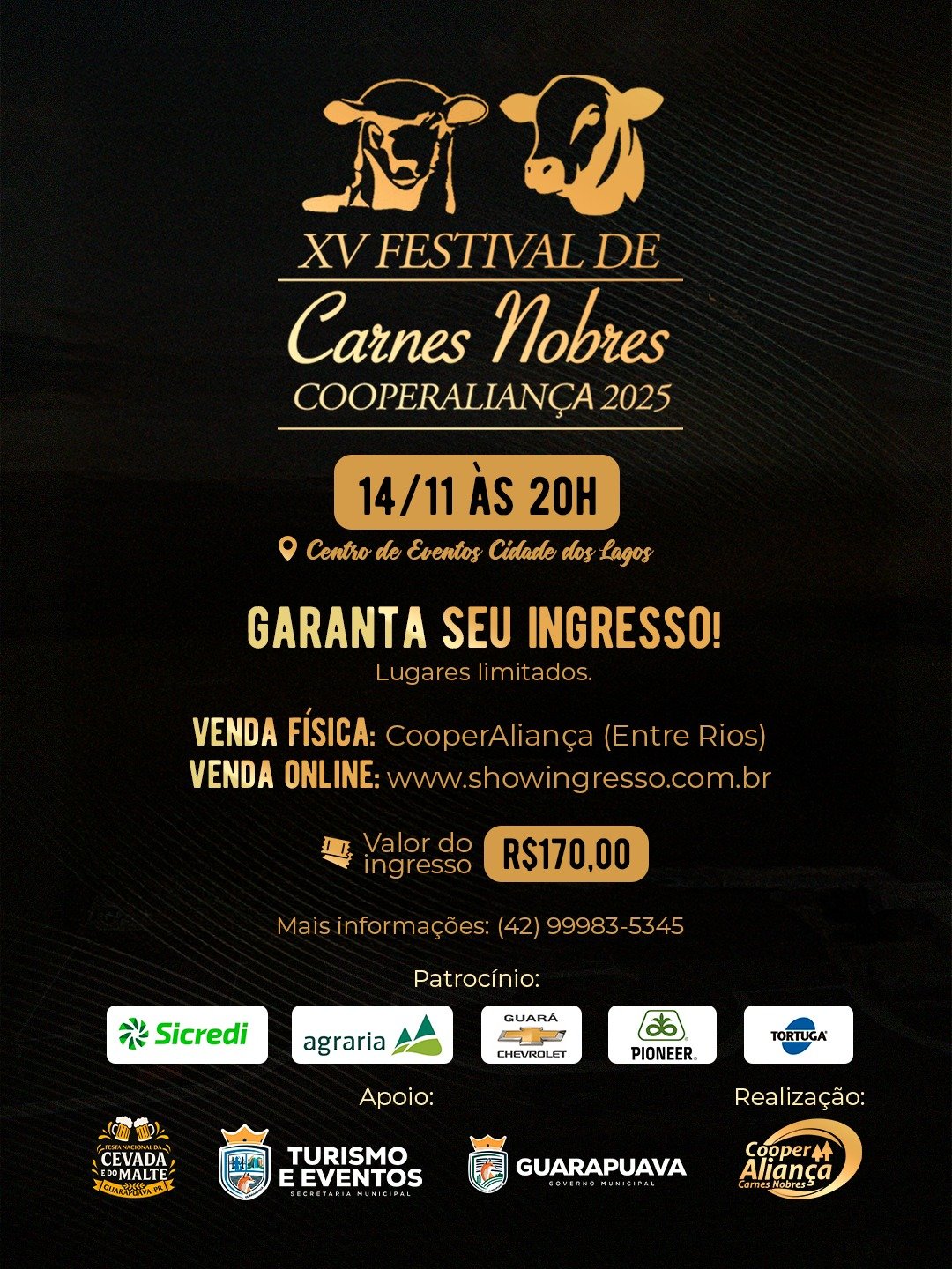 Mais do que um jantar, o evento é uma celebração à qualidade, à origem controlada e ao respeito ao produtor e ao consumidor, valores que consolidam a CooperAliança como referência em carnes nobres no Sul do Brasil. Nesta edição o Festival de Carnes Nobres conta com os seguintes parceiros: Sicredi, DSM Tortuga, Guará Chevrolet, Pioneer e Agrária.