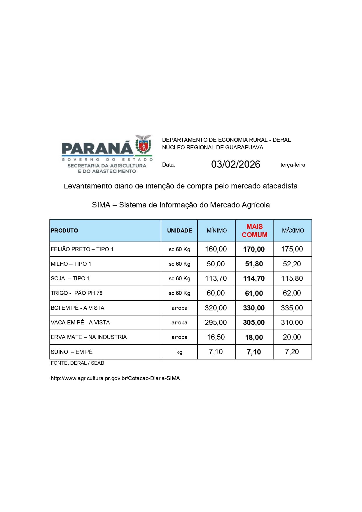 Guarapuava Cotação agrícola para a região de Guarapuava e Irati Share Tweet Publicado 2 horas ago sobre 3 de fevereiro, 2026 Por Redação Compartilhe isso:Facebook18+ Relacionado TÓPICOS RELACIONADOS: NÃO PERCA Duplicação da PR-466 entre Pitanga e Turvo começa a receber placas de concreto Continue Reading VOCÊ PODE GOSTAR CLIQUE PARA COMENTAR Leave a Reply Cancelar respostaO seu endereço de e-mail não será publicado. Campos obrigatórios são marcados com *Comentário * Nome * E-mail * Site Salvar meus dados neste navegador para a próxima vez que eu comentar. Mais recente Videos Guarapuava2 horas ago Cotação agrícola para a região de Guarapuava e Irati Guarapuava3 horas ago Duplicação da PR-466 entre Pitanga e Turvo começa a receber placas de concreto Paraná4 horas ago Safra ganha volume e consolida cenário positivo no campo paranaense Paraná1 ano ago Apicultor de Prudentópolis cria mais de 30 espécies de abelhas Negócios1 ano ago Paraná terá a maior fábrica de biodiesel do mundo Guarapuava1 ano ago Regional de Guarapuava segue líder na produção de cevada no Paraná Close GDPR Cookie Settings Privacy Overview Strictly Necessary Cookies Additional Cookies Powered by GDPR Cookie Compliance Privacy Overview This website uses cookies so that we can provide you with the best user experience possible. Cookie information is stored in your browser and performs functions such as recognising you when you return to our website and helping our team to understand which sections of the website you find most interesting and useful. Strictly Necessary Cookies Strictly Necessary Cookie should be enabled at all times so that we can save your preferences for cookie settings. Enable or Disable Cookies Enabled Disabled If you disable this cookie, we will not be able to save your preferences. This means that every time you visit this website you will need to enable or disable cookies again. Additional Cookies Este site usa os seguintes cookies adicionais: (Liste aqui os cookies que você está usando no site.) Enable or Disable Cookies Enabled Disabled Please enable Strictly Necessary Cookies first so that we can save your preferences! Close GDPR Cookie Settings Privacy Overview Strictly Necessary Cookies Additional Cookies Powered by GDPR Cookie Compliance Privacy Overview This website uses cookies so that we can provide you with the best user experience possible. Cookie information is stored in your browser and performs functions such as recognising you when you return to our website and helping our team to understand which sections of the website you find most interesting and useful. Strictly Necessary Cookies Strictly Necessary Cookie should be enabled at all times so that we can save your preferences for cookie settings. Enable or Disable Cookies Enabled Disabled If you disable this cookie, we will not be able to save your preferences. This means that every time you visit this website you will need to enable or disable cookies again. Additional Cookies Este site usa os seguintes cookies adicionais: (Liste aqui os cookies que você está usando no site.) Enable or Disable Cookies Enabled Disabled Please enable Strictly Necessary Cookies first so that we can save your preferences!