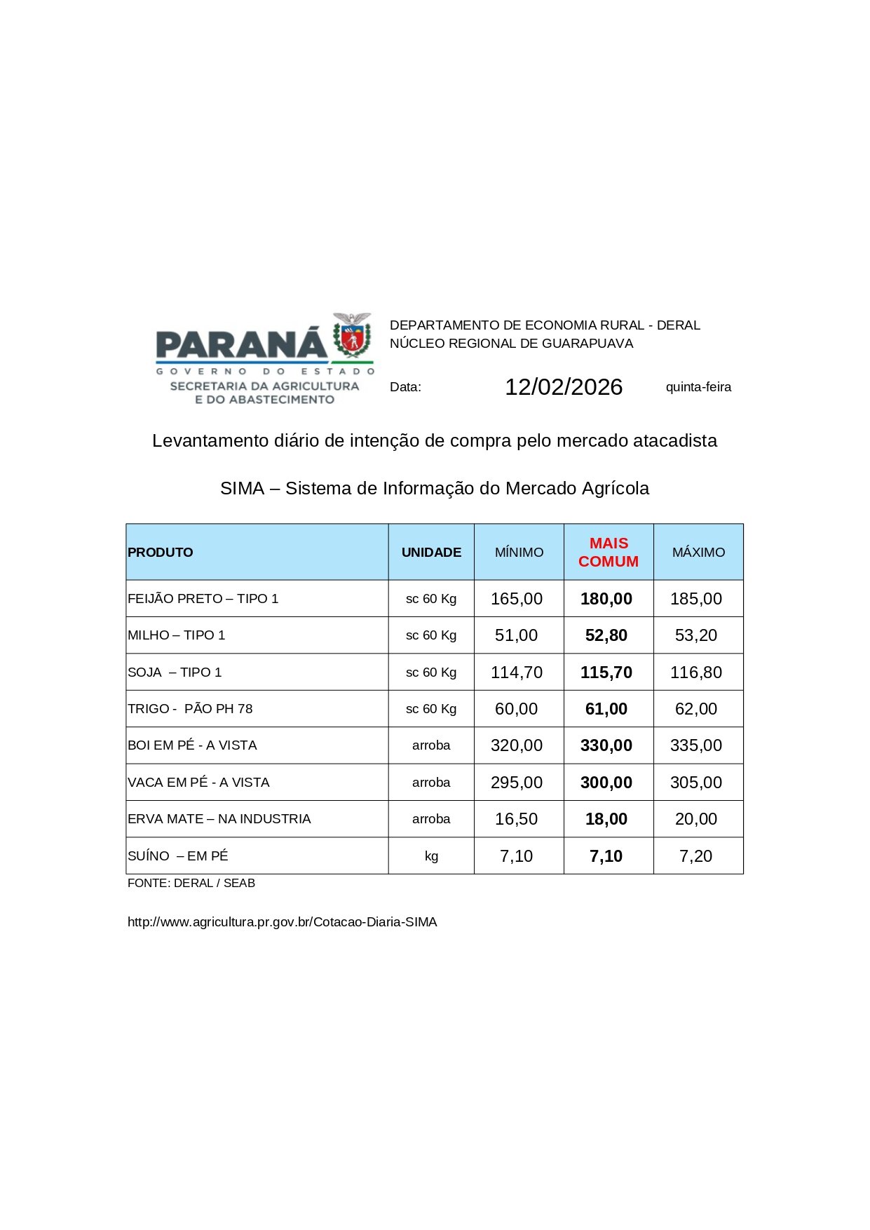 Guarapuava Cotação agrícola para a região de Guarapuava e Irati Share Tweet Publicado 3 horas ago sobre 12 de fevereiro, 2026 Por Redação Compartilhe isso:Facebook18+ Relacionado TÓPICOS RELACIONADOS: Up Next PR: Governo obtém vitória definitiva no TRF4 para usar cadastro rural com base no Código Florestal NÃO PERCA Frente fria marca o retorno das tempestades ao Paraná, prevê o Simepar Continue Reading VOCÊ PODE GOSTAR CLIQUE PARA COMENTAR Leave a Reply Cancelar respostaO seu endereço de e-mail não será publicado. Campos obrigatórios são marcados com *Comentário * Nome * E-mail * Site Salvar meus dados neste navegador para a próxima vez que eu comentar. Mais recente Videos Brasil21 minutos ago Suínos: Exportação atinge recorde para janeiro Brasil2 horas ago Produção de grãos pode chegar a 353,4 milhões de toneladas Paraná3 horas ago PR: Governo obtém vitória definitiva no TRF4 para usar cadastro rural com base no Código Florestal Paraná2 anos ago Apicultor de Prudentópolis cria mais de 30 espécies de abelhas Guarapuava1 ano ago Regional de Guarapuava segue líder na produção de cevada no Paraná Negócios1 ano ago Paraná terá a maior fábrica de biodiesel do mundo Close GDPR Cookie Settings Privacy Overview Strictly Necessary Cookies Additional Cookies Powered by GDPR Cookie Compliance Privacy Overview This website uses cookies so that we can provide you with the best user experience possible. Cookie information is stored in your browser and performs functions such as recognising you when you return to our website and helping our team to understand which sections of the website you find most interesting and useful. Strictly Necessary Cookies Strictly Necessary Cookie should be enabled at all times so that we can save your preferences for cookie settings. Enable or Disable Cookies Enabled Disabled If you disable this cookie, we will not be able to save your preferences. This means that every time you visit this website you will need to enable or disable cookies again. Additional Cookies Este site usa os seguintes cookies adicionais: (Liste aqui os cookies que você está usando no site.) Enable or Disable Cookies Enabled Disabled Please enable Strictly Necessary Cookies first so that we can save your preferences! Close GDPR Cookie Settings Privacy Overview Strictly Necessary Cookies Additional Cookies Powered by GDPR Cookie Compliance Privacy Overview This website uses cookies so that we can provide you with the best user experience possible. Cookie information is stored in your browser and performs functions such as recognising you when you return to our website and helping our team to understand which sections of the website you find most interesting and useful. Strictly Necessary Cookies Strictly Necessary Cookie should be enabled at all times so that we can save your preferences for cookie settings. Enable or Disable Cookies Enabled Disabled If you disable this cookie, we will not be able to save your preferences. This means that every time you visit this website you will need to enable or disable cookies again. Additional Cookies Este site usa os seguintes cookies adicionais: (Liste aqui os cookies que você está usando no site.) Enable or Disable Cookies Enabled Disabled Please enable Strictly Necessary Cookies first so that we can save your preferences!