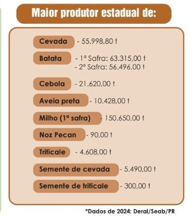 A batata, somando primeira e segunda safra, apresentou VBP de R$ 228,9 milhões, enquanto a cevada contribuiu com R$ 81,6 milhões. Esses resultados reforçam a diversidade da matriz produtiva do município, que também lidera, em nível estadual, a produção de cevada, batata, cebola, aveia preta, milho (1ª safra), noz-pecã e sementes. (veja na arte abaixo).